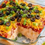 - Garnish with olives and onions: Scatter the sliced black olives and chopped green onions on top of the cheese layer to finish the dip.