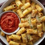 Crispy and flavorful Air Fryer Pasta Chips made from al dente rigatoni pasta, tossed with garlic, olive oil, and topped with parmesan cheese. A perfect crunchy appetizer or snack served with dipping sauce.