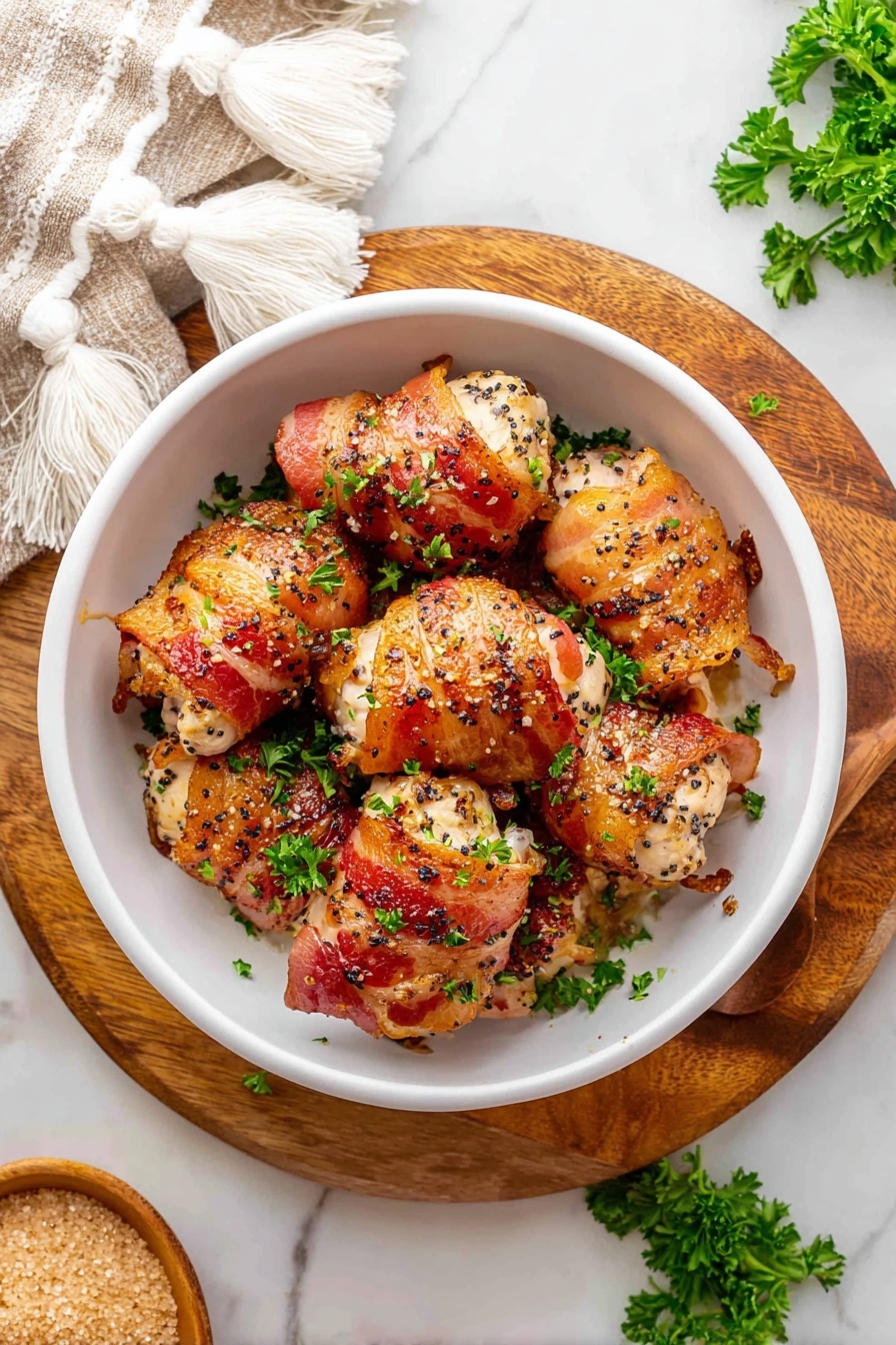 Sprinkling freshly chopped parsley over the baked chicken bites adds a burst of color and a light herbal note that complements the rich bacon and sweet brown sugar coating beautifully. You could also try a dusting of smoked paprika for a little smoky kick or a drizzle of a tangy honey mustard sauce on the side for dipping.