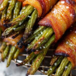 Delicious bacon wrapped green beans offer a savory and slightly sweet side dish perfect for any meal. Fresh green beans are bundled in crispy, thin-cut bacon and brushed with a flavorful butter glaze featuring garlic and brown sugar substitute before roasting to tender perfection.