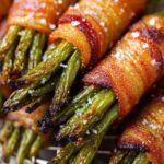 Delicious bacon wrapped green beans offer a savory and slightly sweet side dish perfect for any meal. Fresh green beans are bundled in crispy, thin-cut bacon and brushed with a flavorful butter glaze featuring garlic and brown sugar substitute before roasting to tender perfection.