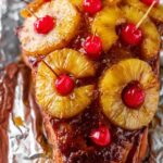 - Apply Glaze and Arrange Pineapple: Place the ham on a foil-lined sheet pan or roasting pan. Drizzle the glaze over the ham, using a cooking brush if necessary to get the glaze into the cuts and scored areas. Secure pineapple slices and optional maraschino cherries onto the ham surface using toothpicks. Tent the ham loosely with foil to insulate without touching the glaze.
