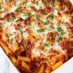 This easy baked ziti pasta casserole combines tender pasta with a rich meat sauce, creamy ricotta, and melty mozzarella and parmesan cheeses for a comforting and satisfying Italian-American classic perfect for family dinners.