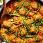 A flavorful recipe for basil ginger meatballs simmered in a rich coconut red curry sauce, served over jasmine rice. The dish features tender ground chicken meatballs infused with fresh and dried basil, ginger, and aromatic spices, complemented by a vibrant curry sauce made with bell peppers, coconut milk, and green beans. Perfect for a satisfying and exotic dinner.