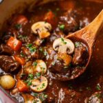 Beef Bourguignon is a classic French stew featuring tender beef chuck slow-cooked in rich Burgundy wine with aromatic herbs, bacon, pearl onions, and mushrooms. This comforting dish is perfect for a hearty dinner and develops deeper flavors when made ahead and reheated.