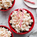Delight in the festive flavors of Candy Cane Popcorn, a perfect holiday treat combining air-popped popcorn coated in smooth white chocolate and sprinkled with crushed candy canes for a sweet, minty crunch.