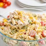 I generally don’t freeze this pasta salad because the creamy ranch dressing and fresh veggies don’t thaw well, but if you need to, try freezing just the cooked pasta and chicken separately without dressing, and add fresh dressing after thawing.