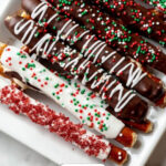 Delicious homemade chocolate covered pretzels featuring semisweet baking chocolate dipped pretzel rods, optionally drizzled with vanilla almond bark and topped with your favorite sprinkles and nuts. Perfect for gifting or snacking, these treats combine salty and sweet in an easy-to-make recipe.