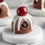- Decorate the truffles: Once coated, if the chocolate is firm, add about ½ teaspoon of white chocolate to the top of each truffle and place half a red glacé cherry on top for decoration.