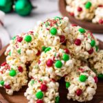 Delightfully festive Christmas Popcorn Balls made with buttery popcorn coated in melted marshmallows, studded with colorful red and green M&M candies and festive sprinkles. Perfect as a holiday treat or gift, these popcorn balls are easy to make and fun to enjoy.
