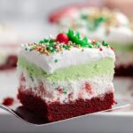 - Add Whipped Topping and Sprinkles: Once set, spread the remaining 8 ounces of whipped topping on top of the pudding layer. Finish by sprinkling holiday colored sprinkles generously over the top.