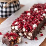 Delight in the festive flavors of Christmas Rocky Road, a decadent no-bake dessert featuring melted chocolate, almond butter, roasted almonds, dried cranberries, mini marshmallows, and tangy pomegranate seeds, all kissed with warm holiday spices. Perfect for holiday celebrations or cozy winter treats.