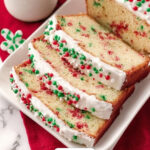 - Decorate and Serve: Spread the icing evenly over the cooled bread using a rubber spatula. Sprinkle extra Christmas sprinkles on top if desired. Allow the icing to set before slicing and serving.