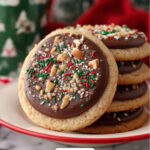 I like to keep it simple and festive — after spreading the melted chocolate, sprinkling on toasted pecans and bright holiday sprinkles makes these cookies feel party-ready. Sometimes I add a tiny pinch of flaky sea salt on top to amplify the sweet-salty vibe.