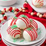 - Drizzle Red Candy: Transfer melted red candy melts to a storage bag and cut a small corner off. Drizzle the red candy back and forth over the coated truffles.