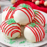 Delightful Little Debbie Christmas Tree Cake Balls made by combining moist Christmas Tree Cakes with cream cheese, coated in smooth white almond bark, and decorated with festive red candy melt drizzle and green sanding sugar. Perfect for holiday celebrations and easy to prepare ahead.