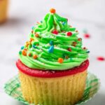 - Add Decorations: Wrap a string of the peeled Twizzler candy around the bottom of each cupcake to mimic a tree skirt. Sprinkle sequin-style rainbow sprinkles over the frosting and place a star-shaped sprinkle at the top to complete your Christmas tree look. Optionally, dust with confectioners sugar to resemble snow.