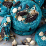 Use a cookie scoop to portion 2 tablespoon-sized dough balls. Roll them smooth between your palms, then gently press the reserved white chocolate chips and chopped cookies all over the outside. I love this because it adds extra crunch and also makes each cookie look like a lively little monster!