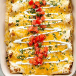 Cream cheese chicken enchiladas featuring tender shredded chicken enveloped in a creamy, tangy sauce made with cream cheese, green chiles, salsa verde, and sour cream. This easy and freezer-friendly dish is topped with melted Mexican blend cheese and optional fresh garnishes, ready to enjoy in under an hour.