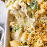 Medium pasta shells are ideal because their shape holds the creamy sauce beautifully. However, you can also use penne, rotini, or rigatoni – just avoid very thin pastas since they can become mushy when baked.