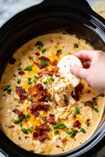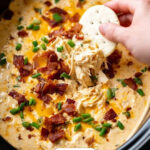 After 2 hours, stir the dip thoroughly to create a silky smooth mixture that’s bursting with cheesy, smoky flavor. Sprinkle the remaining ¼ cup of bacon and 2 tablespoons of chopped green onions over the top for a fresh, crispy garnish that adds a pop of color and an extra layer of yum. Serve this warm alongside your favorite baguette slices, crackers, or chips, and watch it disappear fast!