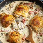 - Simmer Chicken: Return the chicken thighs and cooked bacon to the pan. Reduce the heat to low, cover, and simmer gently for 25 to 30 minutes until the chicken is tender and the sauce has thickened.