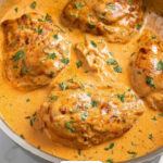 Marry Me Chicken is a creamy, flavorful chicken dish featuring a rich sauce made with sundried tomatoes, garlic, cream cheese, and Parmesan cheese. The chicken breasts are pounded thin, seasoned, and seared to golden perfection before being simmered in a luscious wine and broth-based sauce. This elegant yet comforting recipe is perfect for an impressive weeknight dinner or special occasion.