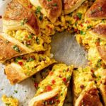 A delicious and visually appealing Crescent Breakfast Ring featuring scrambled eggs, crispy bacon, colorful bell peppers, and melted cheddar cheese wrapped in flaky crescent rolls. Perfect for a hearty breakfast or brunch that’s easy to prepare and sure to impress.