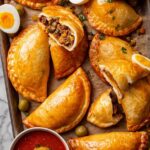 Traditional Brazilian beef empanadas featuring a flaky shortcrust pastry filled with a flavorful mixture of ground beef, chorizo, potatoes, and spices, baked to golden perfection. Perfect as an appetizer or main course, served hot with a tangy dipping sauce.