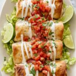 This crunchy, savory chimichangas recipe features a flavorful chicken and pinto bean filling, wrapped in warm flour tortillas, fried to golden perfection, and topped with fresh lettuce, salsa, sour cream, and tomatoes. Perfect for a satisfying Mexican-inspired meal that combines crispy textures and bold flavors.