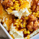This Mashed Potato Casserole with Crispy Chicken is a comforting and hearty dish featuring creamy mashed potatoes layered with sweet corn, melted cheddar cheese, and topped with crispy chicken tenders. Finished with a savory brown gravy, this casserole is perfect for a satisfying family meal.