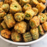 The best way to revive that fresh-from-the-fryer crispness is using an air fryer set to 350 degrees Fahrenheit for 4 to 5 minutes. If you don’t have an air fryer, bake the okra in a 375 to 400 degrees Fahrenheit oven for 10 to 15 minutes, turning once halfway through. To keep the crunch, avoid microwaving—it’s tempting but tends to make the coating soggy.
