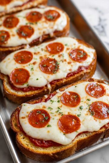 - Add Toppings: Remove the toasted bread from the oven and spread pizza sauce evenly over each slice. Top with shredded mozzarella cheese and arrange pepperoni slices or your preferred toppings.