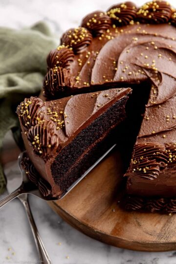 If your cake layers have domed tops, level them off carefully with a serrated knife so your cake stacks perfectly flat. Place one layer on your serving plate or cake stand and spread about 1 cup (250g) of frosting evenly across the top. Add the second layer and cover the entire cake’s top and sides with the remaining frosting. For a smooth, professional finish, use a bench scraper to gently smooth out the sides. If you want to get fancy, pipe extra frosting on top, or sprinkle with gold shimmer sprinkles for a festive touch!