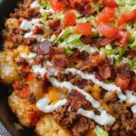 - Assemble Casserole: Spray a 10.5-inch cast-iron skillet with nonstick spray. Arrange a layer of tater tots on the bottom, then spread half of the beef mixture evenly on top. Sprinkle 1/4 cup cheddar and mozzarella cheeses over the beef. Add the remaining tater tots in a puzzle-like formation, then top with the remaining beef, bacon pieces, and the final 1/4 cup cheddar cheese.