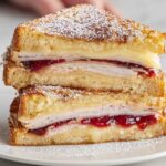 A classic Monte Cristo sandwich featuring layers of Swiss cheese, ham, turkey, and a touch of sweetness from red currant jelly. This rich, melty grilled sandwich is dipped in an egg mixture and cooked to golden perfection, dusted with confectioner’s sugar, and served with warm jelly on the side.