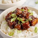 - Serve: Serve the crispy orange tofu over rice, garnished with sliced green onions and toasted sesame seeds if desired. Enjoy!