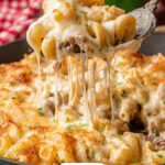 I’ll be honest, the first time I tried this Crispy Philly Cheesesteak Pasta Recipe, I wasn’t sure how a pasta version of a Philly cheesesteak sandwich would turn out. But once that bubbly, melty provolone cheese browned under the broiler and that steak mingled with smoky mushrooms and peppers, I was hooked. It’s just the perfect blend of creamy, savory, and crispy all in one pot!