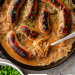 To serve, plate the sausages over creamy mashed potatoes and generously ladle the onion gravy on top. Don’t forget a side of fresh peas to add a pop of color and sweetness – it’s the perfect finishing touch to this hearty dish. Enjoy every comforting bite!