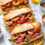 This classic Louisiana shrimp po' boy recipe features crispy, golden fried shrimp nestled in a light and pillowy French bread roll, dressed with tangy remoulade, pickles, and fresh veggies. A flavorful and iconic American sandwich perfect for a satisfying lunch or dinner.