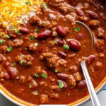 Reheat gently on the stove over low heat with a splash of beef broth or water to loosen it if it thickens too much. Stir often to prevent sticking, and heat until steaming hot. Microwave works fine, but stirring halfway through helps keep the chili nice and even.