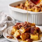Once out of the oven, I always loosely cover the casserole with foil and let it rest for about 10 minutes. This helps everything set up nicely, making it easier to cut and serve. Drizzle generously with warm maple syrup and enjoy!