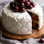 - Decorate (optional): For a classic look, cover with marzipan and white fondant, then decorate sides with quilted patterns and silver balls as shown. Top with cherries dusted with icing sugar. Alternatively, top with fresh fruit and icing sugar or drizzle with a white glaze (without lemon juice).