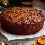 This traditional Christmas Cake is a rich, moist fruit cake soaked in cherry brandy, perfect for holiday celebrations. Packed with mixed dried fruits, glacé cherries, and warm spices, the cake is slowly baked to develop deep flavors and is ideal for marzipanning and icing after weeks of maturation.