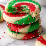 These festive Christmas Pinwheel Cookies are a delightful treat featuring layers of red, green, and white dough rolled together into beautiful swirls. Perfect for holiday celebrations, these buttery cookies are adorned with holiday sprinkles and offer a colorful and tasty addition to any cookie platter.