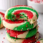These festive Christmas Pinwheel Cookies are a delightful treat featuring layers of red, green, and white dough rolled together into beautiful swirls. Perfect for holiday celebrations, these buttery cookies are adorned with holiday sprinkles and offer a colorful and tasty addition to any cookie platter.