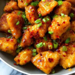 A spicy and sweet Firecracker Chicken dish featuring crispy chicken pieces tossed in a tangy buffalo sauce with a hint of brown sugar and red pepper flakes, baked to perfection and garnished with fresh green onions.
