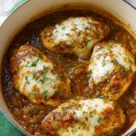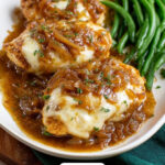 French Onion Chicken is a deeply flavorful entrée featuring pan-fried chicken breasts topped with a rich sauce of caramelized onions, white wine, fresh herbs, and melted Gruyere and Parmesan cheese. This elegant dish combines comforting French onion flavors with tender, golden chicken for a meal sure to impress family and guests.