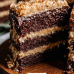 Traditional German Chocolate Cake featuring moist chocolate layers and a rich coconut pecan frosting. This classic dessert combines the deep flavor of chocolate with a sweet, nutty topping perfect for any celebration.