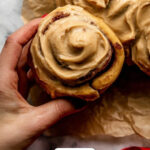 Bake at 350ºF for about 28-32 minutes until golden brown but still soft. If you notice the tops getting too dark, tent with foil to prevent over-browning. Let them cool for about 15 minutes before frosting so that the cream cheese spread doesn’t melt away but stays soft and luscious.
